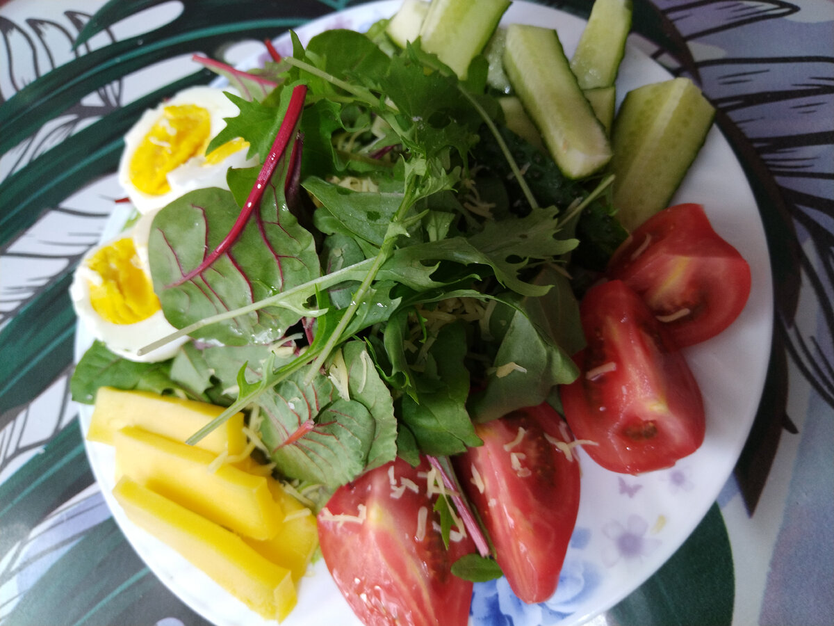 Для приготовления салата можно брать любую зелень которая вам нравится. У меня это- Лист салата Мангольд Мицуна Руккола Огурец Помидорка Ну и конечно же белок-это 2 яйца и твердый сыр 50 гр. Вся эта зеленка продается в гипермаркете, на рынке. Все поласкаем под водой, сушим полотенчиком. Для салата нужно 100-150 гр этой зеленки. Выкладываем ее на тарелочку, сервируем помидором, огурчиком, яйцом и сыром. Зелень можно приправить соком лимона и чайной ложкой масла оливы или подсолнечным маслом. Салат готов. Его можно есть как на завтрак так и на ужин.Очень богат витаминами. А низкокалорийность нам нужна для нашего красивого силуэта.