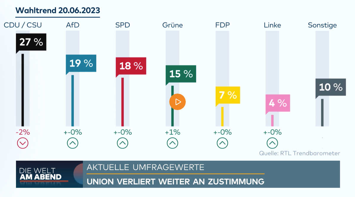 Обзор немецких медиа 🗞(+)Die Welt в статье «Потери для ХДС/ХСС: AfD набирает уже 25% в небольших муниципалитетах» рассказывает, что рост популярности главной оппозиционной партии ХДС/ХСС приостановился и, достигнув 27% в RTL/ntv-Trendbarometer, упал до самого низкого уровня с ноября 2022 г. AfD остаётся на уровне 19% - в настоящее время каждый четвёртый взрослый среднего возраста проголосовал бы за AfD. Уровень упоротости: умеренный 🟡 Автор: редакционный материал Die Welt. Перевёл: «Мекленбургский Петербуржец». Партии Союза потеряли в общей сложности два процентных пункта в последнем барометре тенденций Forsa для RTL/ntv и упали до 27%. Это их худший показатель с начала ноября 2022 г. AfD остаётся на уровне 19%. Таким образом, она снова опережает СДПГ, которая осталась неизменной - 18%. Показатели СвДП (7%) и Левой партии (4%) также не изменились по сравнению с предыдущей неделей. Зелёные (15%) набрали один процентный пункт [вообще в голове не укладывается даже не то, что они получил