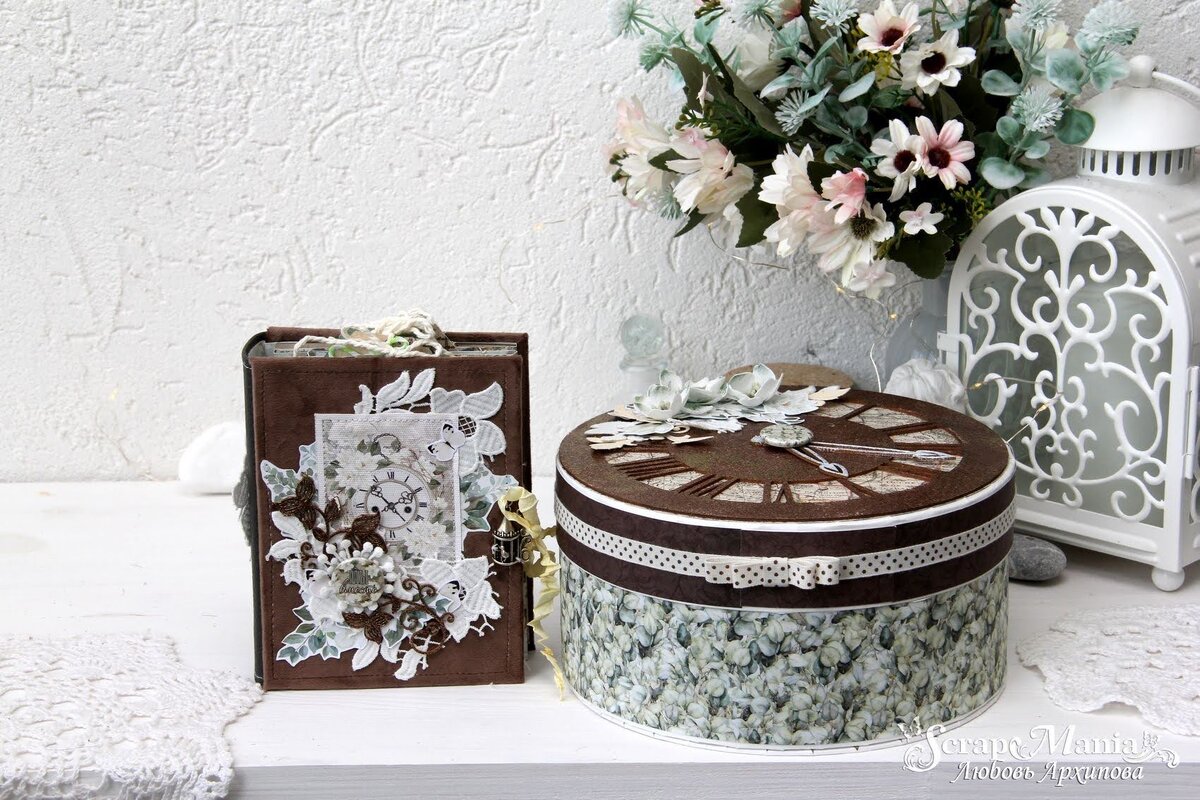 Коробочку делала из заготовки для альбома. Круги были нарезаны из пивного картона лазером, идеально круглые и ровные, так что мне не составило большого труда добавить стеночки и оклеить все скрап-бумагой. Для этого я взяла по несколько листиков из наборов 30,5х30,5 см "Фономикс. Карты. Том 1" и 30,5х30,5 см "Улочки счастья". Диаметр коробочки 21 см, высота 11 см. Коробочка сверху украшена чиповым циферблатом, который я покрыла коричневой с золотом пудрой для эмбоссинга. Так же мне пригодилось кружево, вырубка ножами "Русские сказки. Листья", "Русские сказки. Листья 2" и "Русские сказки. Листья 3". В центре циферблата есть чиповые стрелочки, а саму серединку украшает фишка из набора фишек "Улочки счастья. Любовь". На крышке на боковой поверхности я разместила репсовую ленту натурального цвета с коричневыми горошками. Так же из этой ленты сделала аккуратный бантик. Так же крышку украшают мои самодельные цветочки из фома, сделанные ножом "Анемон"