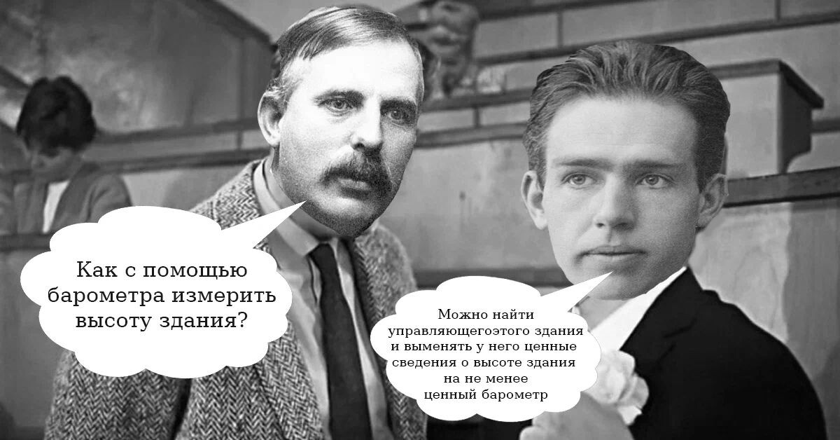 Казалось бы, правильный ответ очевиден любому школьнику. Но он не единственный. Известный исторический анекдот поможет вам по-новому взглянуть на подходы к решению привычных задач. Сэр Эрнест Резерфорд, президент Королевской Академии и лауреат Нобелевской премии по физике, рассказывал следующую историю, служащую великолепным примером того, что не всегда просто дать единственно правильный ответ на вопрос. «Некоторое время назад коллега обратился ко мне за помощью. Он собирался поставить самую низкую оценку по физике одному из своих студентов, в то время как этот студент утверждал, что заслуживает высшего балла. Оба, преподаватель и студент согласились положиться на суждение третьего лица, незаинтересованного арбитра; выбор пал на меня. Экзаменационный вопрос гласил: «Объясните, каким образом можно измерить высоту здания с помощью барометра». Ответ студента был таким: «Нужно подняться с барометром на крышу здания, спустить барометр вниз на длинной веревке, а затем втянуть его обратно и и