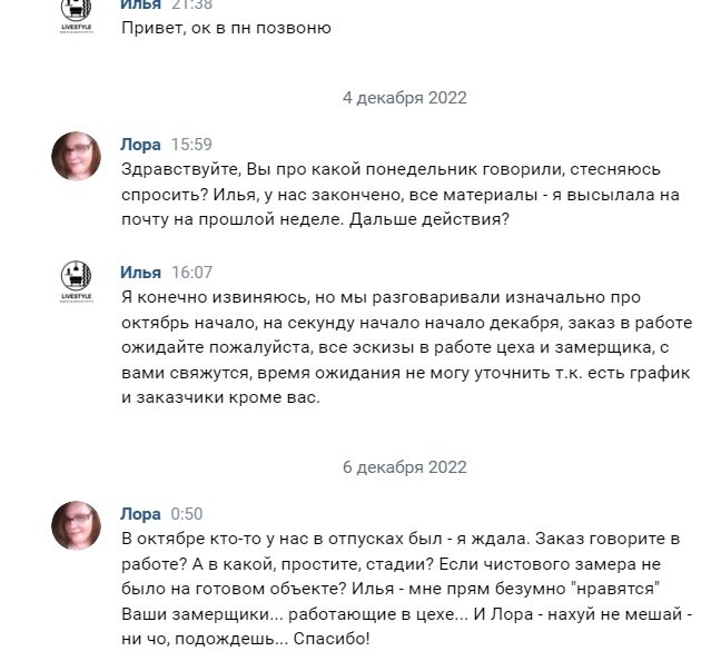 Последний раз, когда я толком писала про НАШ ремонт - это перед новым годом. К концу ноября были закончены отделочные работы и я показывала сделанное . Потом долгое время - тишина. Рассказываю... Отделка закончена, я знала, что мебельщики должны приехать с отпуска, но от них тишина и ... диалог начался 26 ноября, где я спросила про "когда" и мне ответили ниже. В порыве негодования на мебельщиков (про меня тупо забыли и поставили в "очередь" аж на 26 апреля 2023 года) я начала искать других - указывая, что материал (ЛСДСП) у меня уже куплен и основной механизм кухни - тоже. Мой "племянник" Олежка (сын моей подруги Веры и занимается модульными кухнями) - прислал своего замерщика. Он быстро приехал, обмерил и... по телефону - отказался. Ничего не понимая, мы вызвали второго мебельщика - отказ. Третьего - тоже отказался. Шестого, седьмого, восьмого... Почти весь январь и середину февраля у нас с завидной постоянностью побывало 11 изготовителей мебели. И все как один - отказывались. Пока