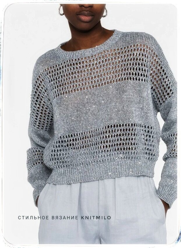 Серый джемпер связан изо льна в сочетании с микропайетками.