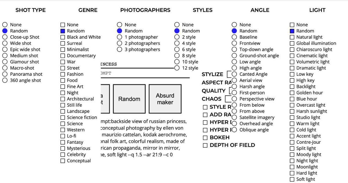 На сайте Pactalom.space была опубликована обширная коллекция промтов для графической нейронной сети. Пользователи могут выбирать несколько параметров, таких как глубина резкости, уровень качества, стиль, отражение, типаж и другие, чтобы получить желаемое фото.