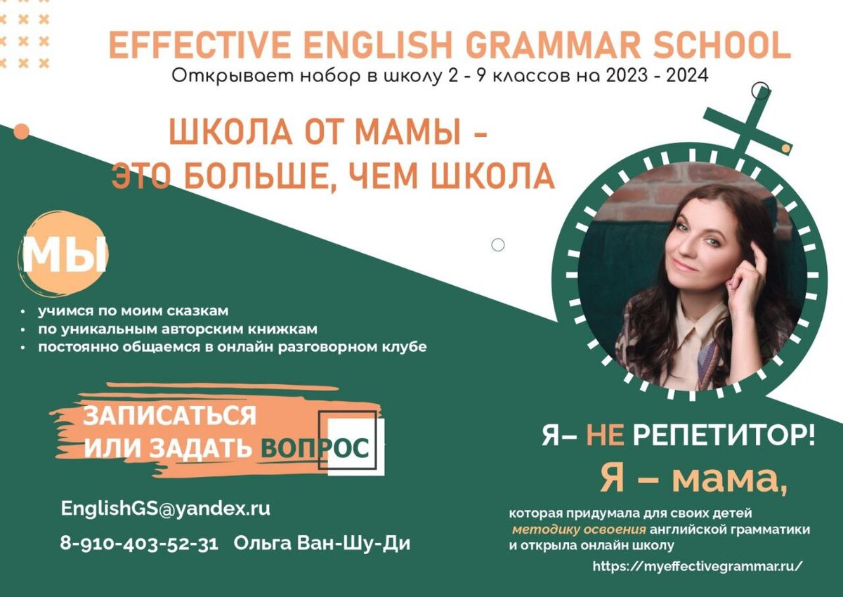 Я -Ольга, основательница школы Effective English Grammar School. Cсылка на наш сайт https://myeffectivegrammar.ru/.По первому образованию я - юрист, но свой интерес к обучению детей я обнаружила, когда мои собственные дети были маленькими. Я не нашла для них тот образовательный продукт по английскому языку, который искала.