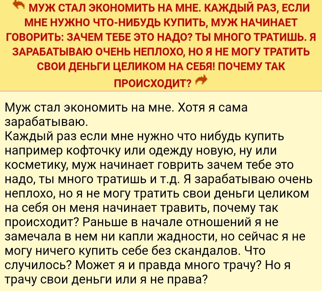 Кто из вас имеет заначки от мужа? 😁 Кому приходится сильно занижать цены на купленные вещи? 😉 Если вы себя узнали, то не чужда вам будет история одной подружки⬇️ А ведь героиня истории, заметьте, сама работает, обеспечивает свои нужды. Вот поэтому ее муженек, наверняка, возжелал, чтоб и его нужды обеспечивались 😁 Спиннинг премиум-класса и новые диски к машине сами себя не купят🙈 Ну логично же. Зачем женщинам столько одежды и косметики? Хватит и одного платья. Чтоб на работу ходить и приносить мужчине деньги. На более важные предметы в жизни ☝️ А то, что есть красивые и ухоженные женщины, от которых глаз не отвести (явно муженьку нашей героини), так пусть блещут красотой, за которую не надо бедным мужчинам платить😉😁 Посмотреть и пустить слюни — это бесплатно. Главное не забрызгать красотку фонтаном слюны. Фаина Раневская права: "Жизнь слишком коротка, чтобы тратить ее на диеты, жадных мужчин и плохое настроение». Девы, вы поняли? 😊