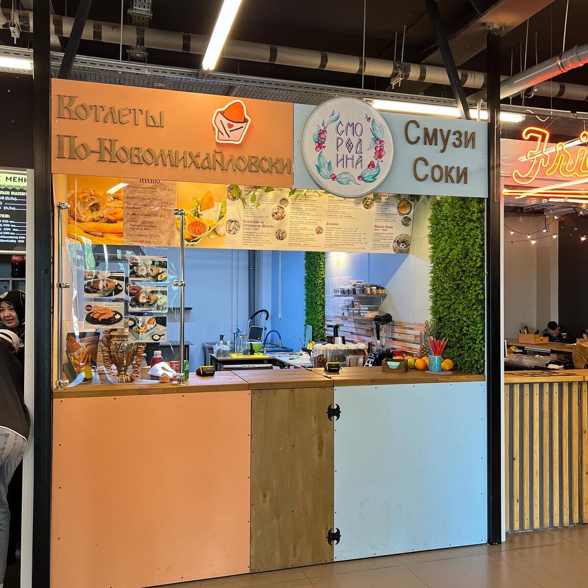 Корнер «Котлеты По-Новомихайловски» открылся на фудкорте ТЦ «Река». Заведение примечательно тем, что принадлежит одному из основателей Burger Records, который в этом году покинул компанию. В меню три вида котлет: классическая, с сыром и с сыром и халапенью, стрипсы, картофель фри и соусы. Точка делит место со смузийной «Смородина», поэтому я взял котлету и смузи. Котлета с сыром «Чеддер» и халапеньо по 240₽. К котлете взял картофель фри (120 ₽) и сырный соус (30 ₽). Заказ подаётся в удобном одноразовом контейнере. По сути это котлета по-киевски. Котлета румяная. Выглядит аппетитно. Корочка из панировки хрустит. Внутри нежнейшее мясо курицы, а в центре горячее сливочное масло с зеленью. Откусывайте аккуратно, горячего масла в котлете много — неровен час, выльется. Подобное я пробовал в Москве, в «Котлете по-киевски» комика Артура Чапаряна. Только там котлета была формой похожа на золотое яйцо, а здесь более привычная для котлеты форма. Интересно, вкусно. Единственно, совершенно