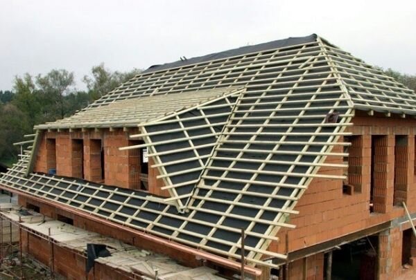 Стропильная система готова. Поверх закреплены полосы гидроизоляции. Можно переходить непосредственно к обустройству обрешетки. Работы ведутся в следующем порядке: