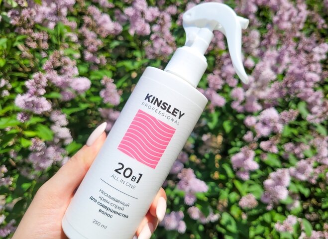 Привет всем!) В последнее время очень многие производители уходовой косметики для волос выпускают средства 8 в 1, 10 в 1 и т.д. Они должны выполнять сразу несколько функций и избавлять нас от необходимости нанесения нескольких продуктов. Отечественный бренд Kinsley не стал скромничать и выпустил на рынок несмываемый крем-спрей сразу 20 в 1😁. Конкретно по пунктам я не нашла всех общений, но думаю, имеется в виду, что спрей должен закрывать абсолютно все потребности волос) Давайте проверять. Внешний вид Белоснежный пластиковый флакон, изначально упакованный в слюду. Объём 250 мл. Для нанесения здесь предусмотрен профессиональный пульверизатор, который отлично сочетается с консистенцией средства и обеспечивает максимально удобное держание. Также он может фиксироваться в закрытом положении с помощью кнопки «on/off», расположенной с двух сторон. Состав, на мой субъективный взгляд, неплох: есть различные силиконы, глицерин, лецитин, гидролизованный кератин, масло арганы, экстракт шёлка и па