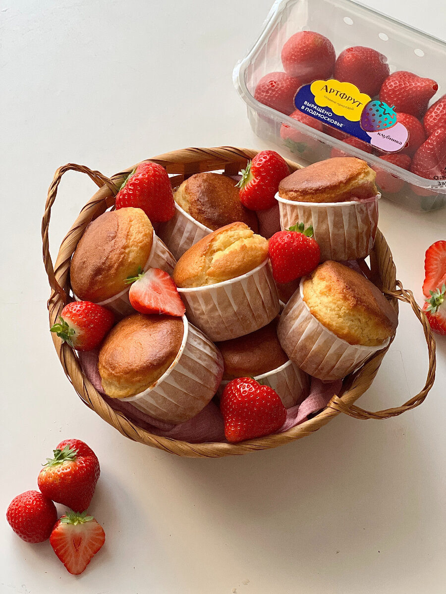 3. У клубники отрезаем хвостики и целую клубничку кладем на дно формы для маффинов, сверху заливаем тестом. Выпекаем при температуре 180° 15-20 минут. Приятного аппетита!