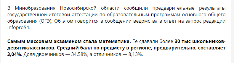 В прошлом году много писали про то, что плохо сдали ОГЭ по математике: называли 25-27% двоек и сокрушались- мол, как же так??? А в этом году.... О! В ЭТОМ,,,, Итак, в ЭТОМ году, пишут, что в 2021 году двойку по ОГЭ -математике получили 21.5% А ну-ка, посмотрим, что писали в 2021 году: Ну, я без комментариев- ибо комментировать- только портить.... Пы.Сы. А министр один и тот же - Сергей Федорчук. Забыл, видать, что раньше говорил... Пы.Сы.2. А остальные регионы что? А хранят гордое молчание...