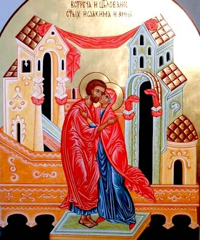 "Анна, стоявшая у ворот, увидела Иоакима идущего, и, подбежав, обняла его, и сказала: Знаю теперь, что Господь благословил меня: будучи вдовою, я теперь не вдова, будучи бесплодною, я теперь зачну".