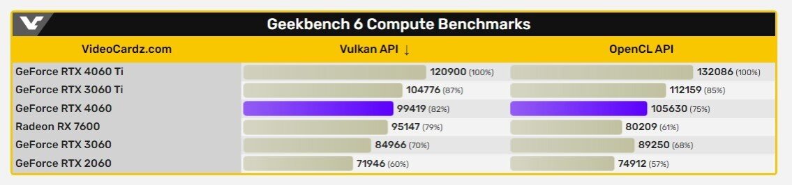 Издание Videocardz опубликовало первые результаты тестов новой видеокарты NVIDIA GeForce RTX 4060. Новинка оказалась быстрее RTX 3060 в среднем на 17-18%. Что касается конкурента в лице AMD Radeon RX 7600, то RTX 4060 выдала на 4% лучше показатели в тесте Vulkan и на 32% в тесте OpenCL. Стоит подчеркнуть, что синтетические тесты в бенчмарках не отражают игровую производительность видеокарт. Характеристики GeForce RTX 4060 GeForce RTX 4060 (8 ГБ) поступит в продажу 29 июня по рекомендованной цене от 299 долларов. Модель с 16 ГБ видеопамяти выпустят в июле. Заглавное фото: Интернет