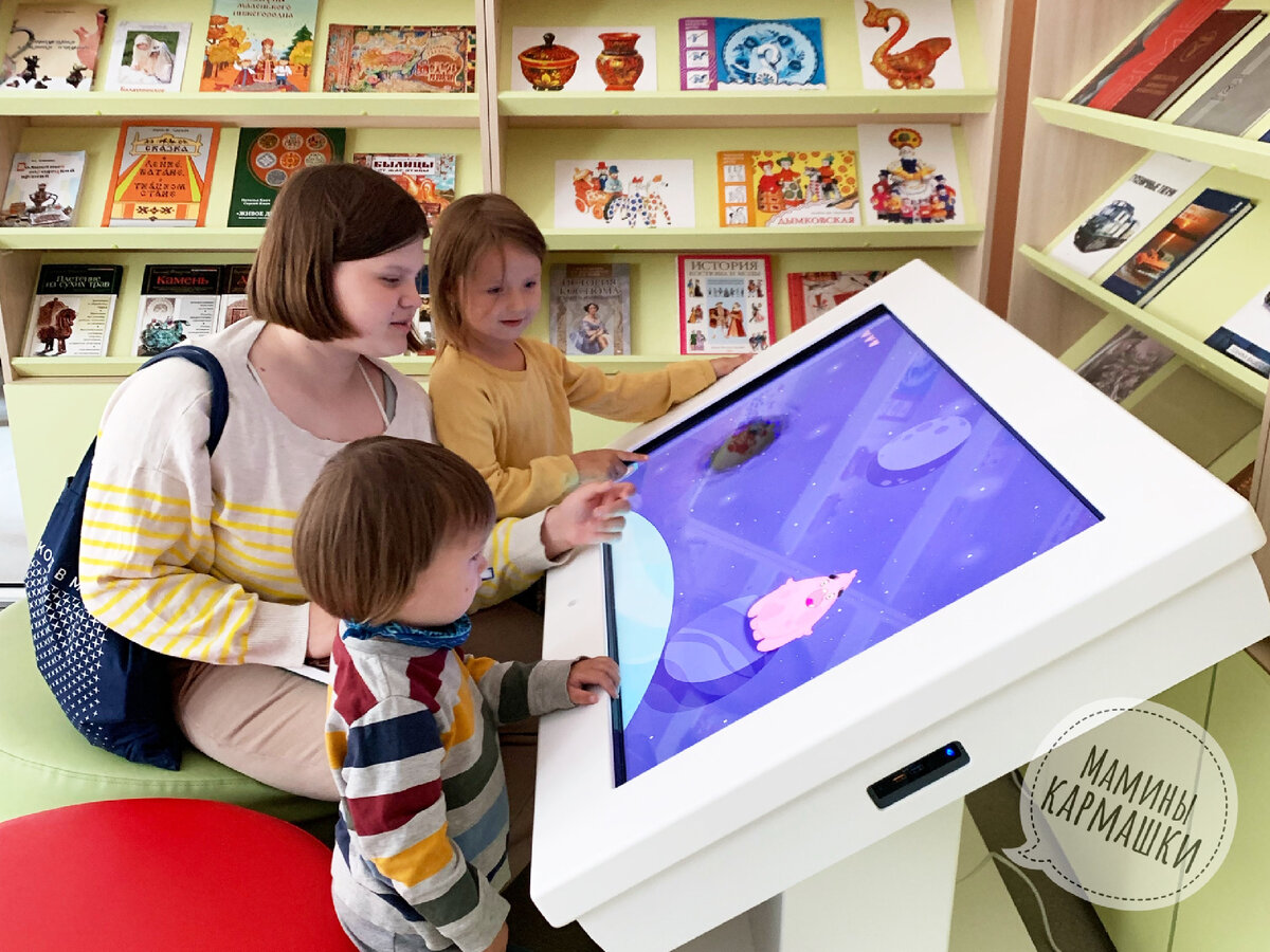 Такой неожиданный опыт у нас был сегодня и.. я его еще перевариваю. В прошлом году мы дошли до самой большой библиотеке в городке, но она была закрыта на ремонт. Сегодня милый оператор из маркетплейса подсказала, что библиотека стильная и обновленная открылась и мы решили прогуляться к ней (почти 3 км в одну сторону - отлично). Ремонт ремонтом, но пандуса не появилось. Нас ждала большая лестница наверх. Хотя крыльцо стоит так, что сбоку отлично уместился бы пандус. Но, наверное, дети колясочники и мамы с колясками - не потенциальные посетители? Удивительно (тут во всех библиотеках так, но обычно лестницы поменьше). Милые диванчики, игрушки, полки.. видно, что много новых книг. И тут.. мои.. не искушенные экранами дети (старшая в теме, смартфон есть, но у младших экранов практически нет в жизни).. увидели это. И оно работает. Тут какая-то банальная игра, она потом читала короткие слова и выбирала нужный предмет на картинке. Можно сказать, что развивающее, но.. но на выходе я получил