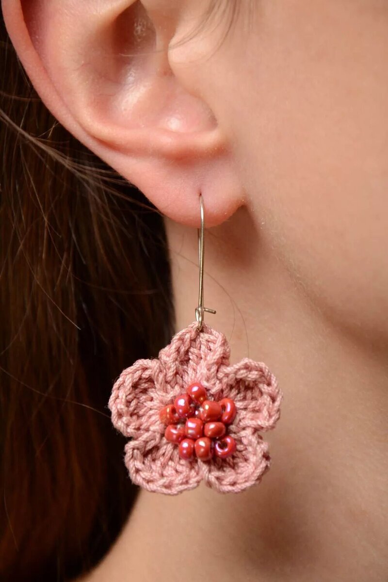 Серьги-цветочки связанные крючком- это отличный аксессуар для лета. Можно связать несколько цветов и комбинированный их между собой. Так же серьги можно связать из остатков пряжи от основного изделия и получится замечательный комплект. Вязать лучше всего из тонкой хлопковой пряжи, чтобы они были маленькими и хорошо держали форму. Украсить можно бисером или бусинкой на ваш вкус. Можно приклеить или пришить стразы. Тут целый букет из лютиков! Цветочки небольшие и сережки не должны быть тяжёлыми. Если вам понравилась эта статья оставьте свой комментарий. Магазин пряжи ВЯЗАНЫЙ.РФ