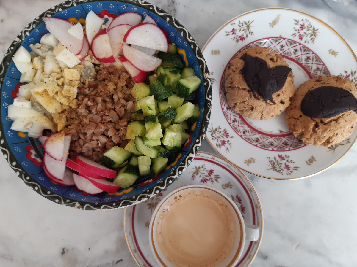 В июне продолжаем питаться экономно и вкусно на небольшую сумму. О запасах на начало месяца и расчете суммы на питание можно узнать ЗДЕСЬ Покупка продуктов 1 -Вкусвилл, Метро, Перекресток Покупка продуктов 2 -Смарт, рынок, WB, Озон, Вкусвилл Покупка продуктов 3 - Вкусвилл, рынок, КБ, Пятерочка, Смарт Все рецепты можно найти в КАТАЛОГЕ РЕЦЕПТОВ На завтрак сегодня боул. Делала с гречкой, это была самая подходящая крупа из имеющихся дома. Вареные яйца были в холодильнике. Только овощи порезала, приправила ароматной солью и оливковым маслом. Это очень вкусно и сытно! И к кофе домашнее овсяно-ореховое печенье. На завтрак осилила только одно, но потом таскала весь день печенюшки, залипательное 🤦♀️ На обед доедали все, что было в холодильнике. У кого что, мне досталась пара ложек булгура со свининой и фунчоза. И снова кофе с печенюшками. Муж на работу брал обед и пирог. На ужин готовила морского окуня - обваливала в кукурузной муке и жарила почти без масла. Покупала его в Смарте. Крупный,