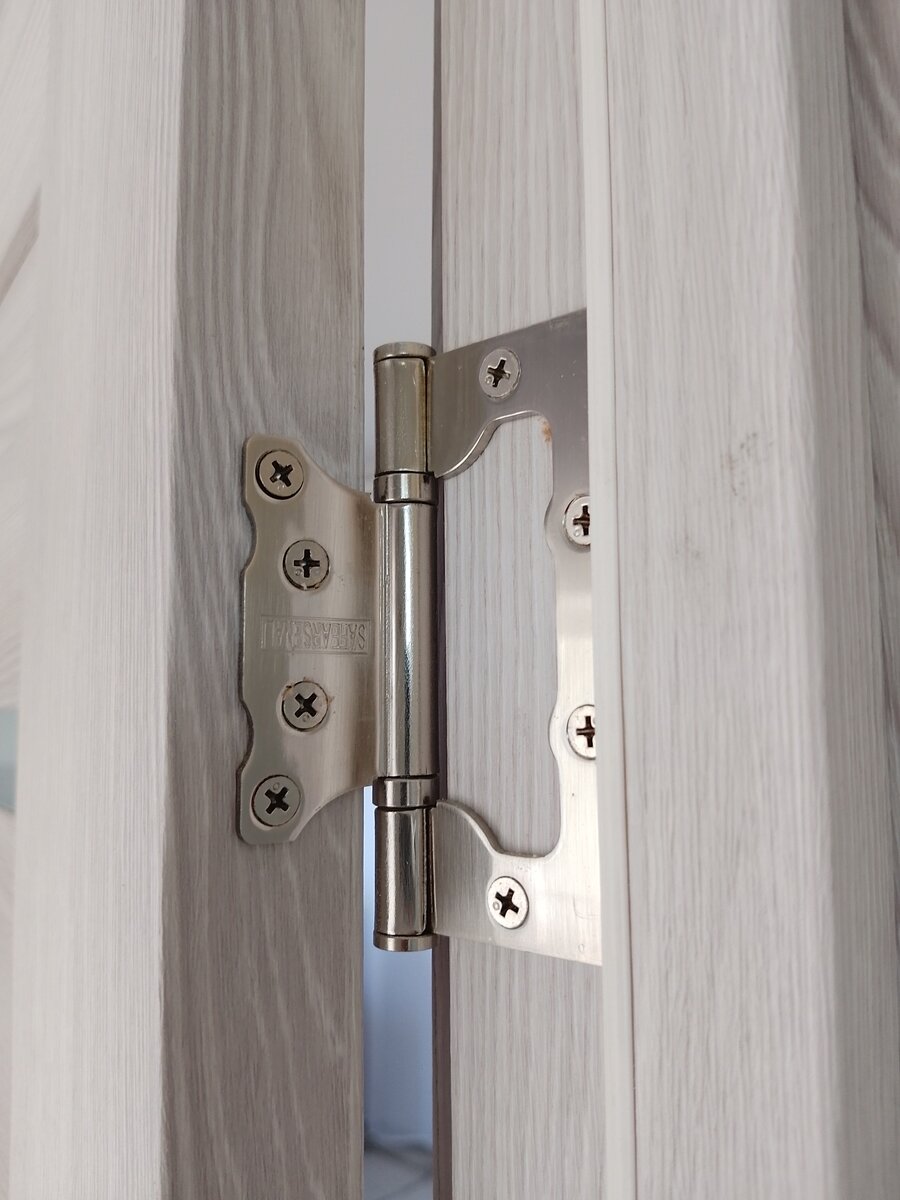 Здравствуйте! Наконец то установил оставшиеся двери. Про покупку и цену дверей уже рассказывал, возвращаться не будем. Что касается установки. Здесь тоже ничего не обычного. Бумажные, хоть и не плохие двери. Давно уже использую петли бабочки. Вот же, придумал кто то. Помню, еще во времена когда не было ручных фрезеров и вот таких вот петель, собираясь на установку, тщательно точили стамеску. Все петли врезались вручную, и цена ошибки очень высока. Сейчас гораздо проще. Выставил, засунул прокладки, приклеил на пену, и вуаля, готово. Приходилось во времена кризиса подрабатывать установщиком, так по две квартиры с пятью, шестью дверями успевали за день сделать. А до двухтысячного, одну квартиру с таким же количеством дверей, правда настоящих, по три дня делали. Плохое фото, не ругайтесь, и тень на стыке выглядит некрасиво, и добор вроде как не прижат, на самом деле там все на месте. По идее добор бы тоже на ус делать, но потом устанавливать, выставлять сложнее, так что ставлю так,