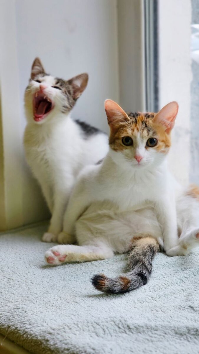 Мы выросли, а вы нас так и не нашли! Нам уже 3 месяца, мы привиты, обработаны и ждём стерилизации не меньше, чем вас, потому что хотим в новый дом. 🐱Мы красивые и очень ласковые, знаем лоток и пользуемся им. Приходите, мы ждём. 🫶Кира и Сима. Ах да! И наша сестра Мотя, но она за кадром.