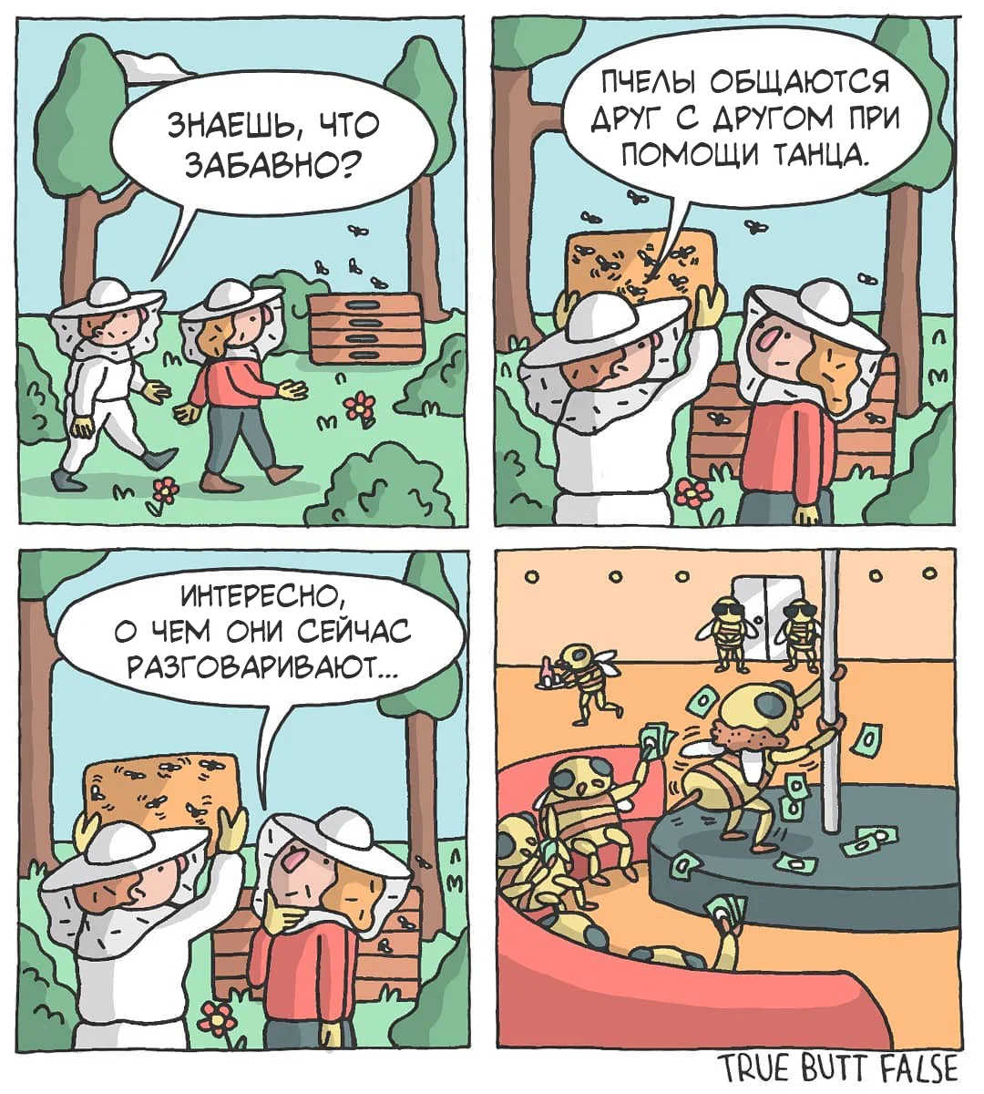 Абсурдный юмор всегда пользовался большой любовью публики. Главная изюминка таких шуток — нарочитая бессмысленность. Чем нелепее, тем смешнее. Творческий дуэт Бесника Спахия и Микеля Джакоби делает комиксы как раз в таком жанре. Сценарий придумывает Микель, а иллюстрации рисует Бесник. Живут они в одном немецком городе Саарбрюккен, находящемся на самой границе с Францией. Следует отметить, что городок довольно богат талантами, именно в этом городе стартовала карьера французской певицы Патрисии Каас и в нем же живут авторы комикс-проекта «War and Peas». Серия веб-комиксов под озорным названием True Butt False начала выходить в 2019 году. Авторы остроумно обыграли особенность английского языка, в котором существует огромное количество слов, звучащих одинаково (а иногда и пишущихся одинаково), но имеющих совершенно разные значения. Причем одно из этих значений может быть не совсем приличным, а иногда и вовсе непристойным. Например, Джон — это не только одно из самых распространенных имен,