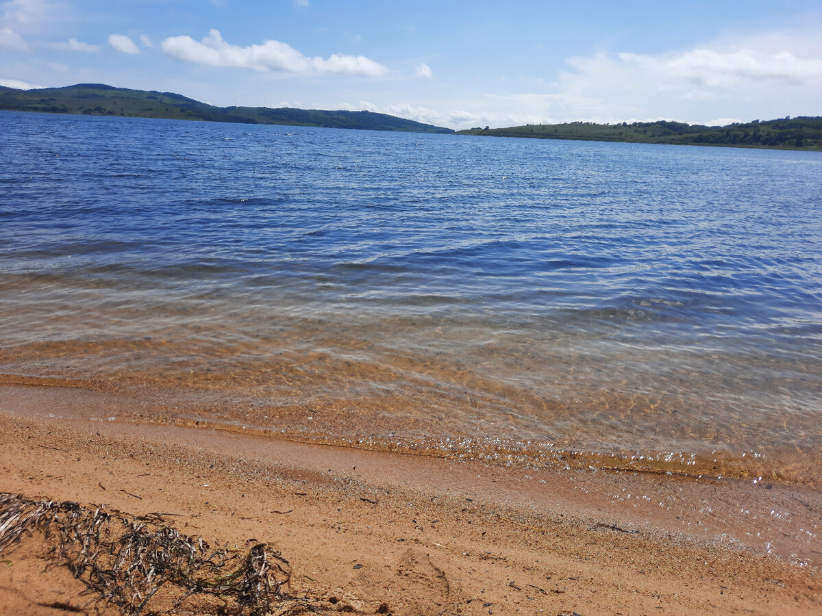 По дороге на заправку в Краскино мы потрогали море, для середины июня вода вполне нормальная, во Владике на Шаморе намного холодней и там еще не купаются, ну я имею в виду обычных нормальных людей. После выезда из Краскино со стороны косы Назимова подул резкий холодный ветер, желание ехать на встречу ему пропало и мы развернулись в сторону Посьета, там море закрыто горами на полуострове Краббе и ветер там редкость. А так-как ветер комарам не мешает, то их тут полно по вечерам, да еще мошка вносит свой вклад, а про клещей нужна отдельная статья. Это место у нас проверено, мы тут даже в конце мая купались, да в мае вода еще не очень, но окунуться можно, рядом на Кубанке море открытое и там вода ледяная. Далее будет бухта перевозная.
