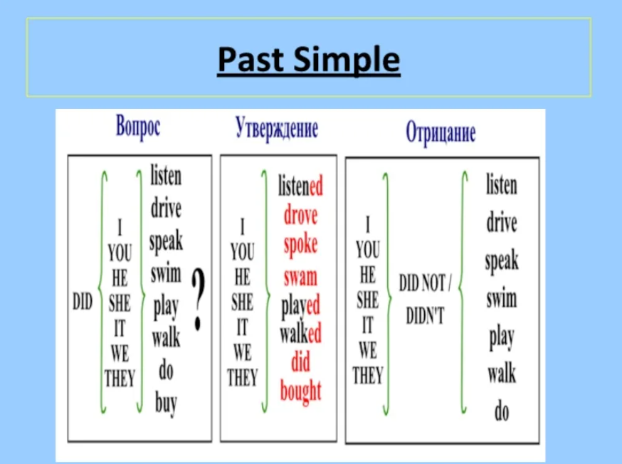 Кстати в моём телеграм канале будут появляться опросы, касательно английского языка: https://t.me/studyenglisha Past Simple: образование Как образуется Past Simple? А очень просто. Не зря же его называют простым. Past Simple, образование: V2 (вторая форма глагола). Вы помните про то, что все глаголы английского языка можно разделить на правильные и неправильные? Past Simple: правила образования простого прошедшего неправильных глаголов Неправильные глаголы живут своей жизнью: у них есть три формы, все три нужно знать наизусть. Чтобы получить Past Simple, мы используем вторую форму (V2) неправильного глагола. Например: Buy - bought - bought Read - read - read Cut - cut - cut Lie - lay - lain Список неправильных глаголов есть в конце любого словаря или справочника. В идеале из справочника этот список должен перекочевать в голову. К счастью, неправильных глаголов не так много. Относительно. А вот все остальные глаголы, которых нет в списке неправильных, называются правильными. И с ними