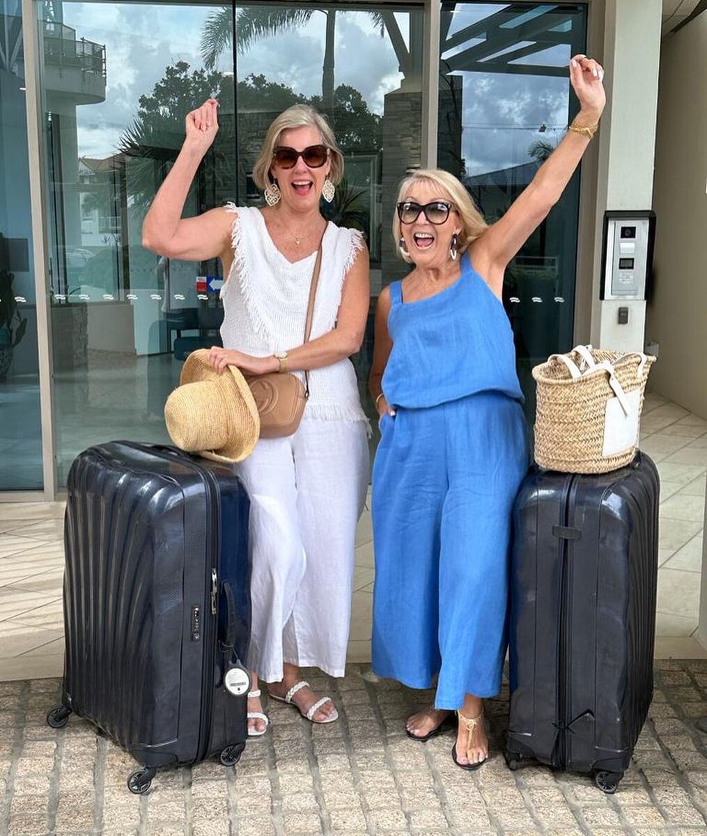 - Льняной брючный костюм – что может быть лучше для летней жары? Свободные брюки на резинке, достаточно свободный топ без рукавов – в таком наряде будет комфортно. Костюм должен быть светлым, например, белым или голубым. Темная одежда не слишком комфортна для жары. В белом костюме топ трикотажный, украшенный бахромой. В голубом обе вещи сшиты из одной ткани.