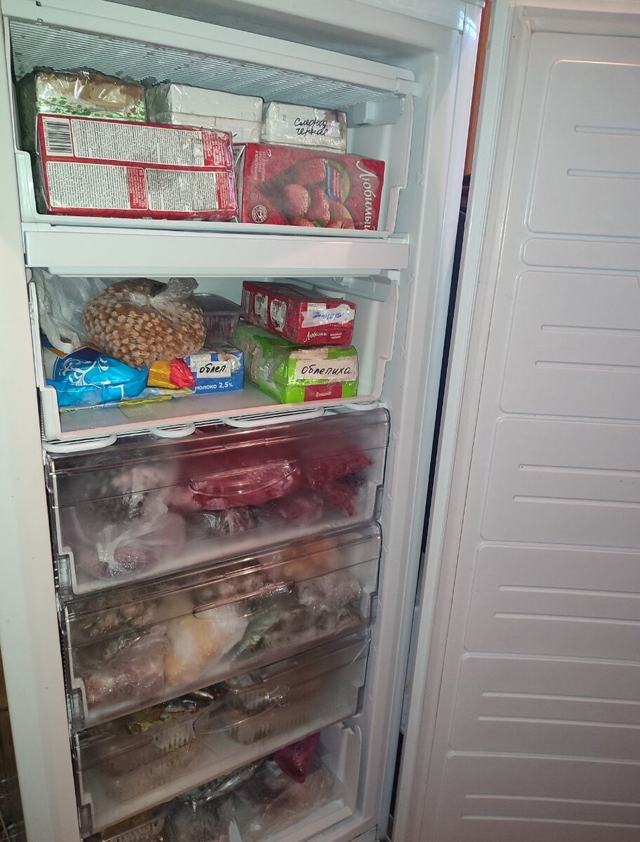 Наверное, начну со стоимости всего этого. Куча ягоды, овощи, тесто, мясо, куча рыбы красной, трески, скумбрии - все морозильные отделения мне обошлись примерно в 2000 рублей. Ну вот и скажите мне кто рассказывает мне про мои перехапы - вы чего-то там сверх меры увидели? Тут есть что-то на года? Тут вроде и получается, что забито всё, а на деле того немного, другого немного и вышло то с Гулькин нос.