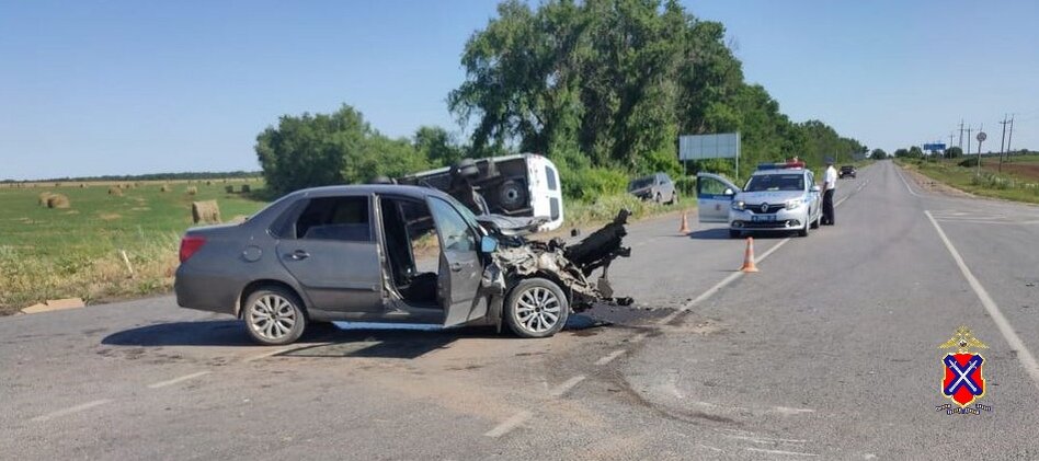 Ранним утром в Чернышковском районе Волгоградской области случилось страшное ДТП: Datsun on-DO врезалась в "Газель Бизнес". В результате от легковушки осталась целой только задняя половина, а фургон лёг набок.