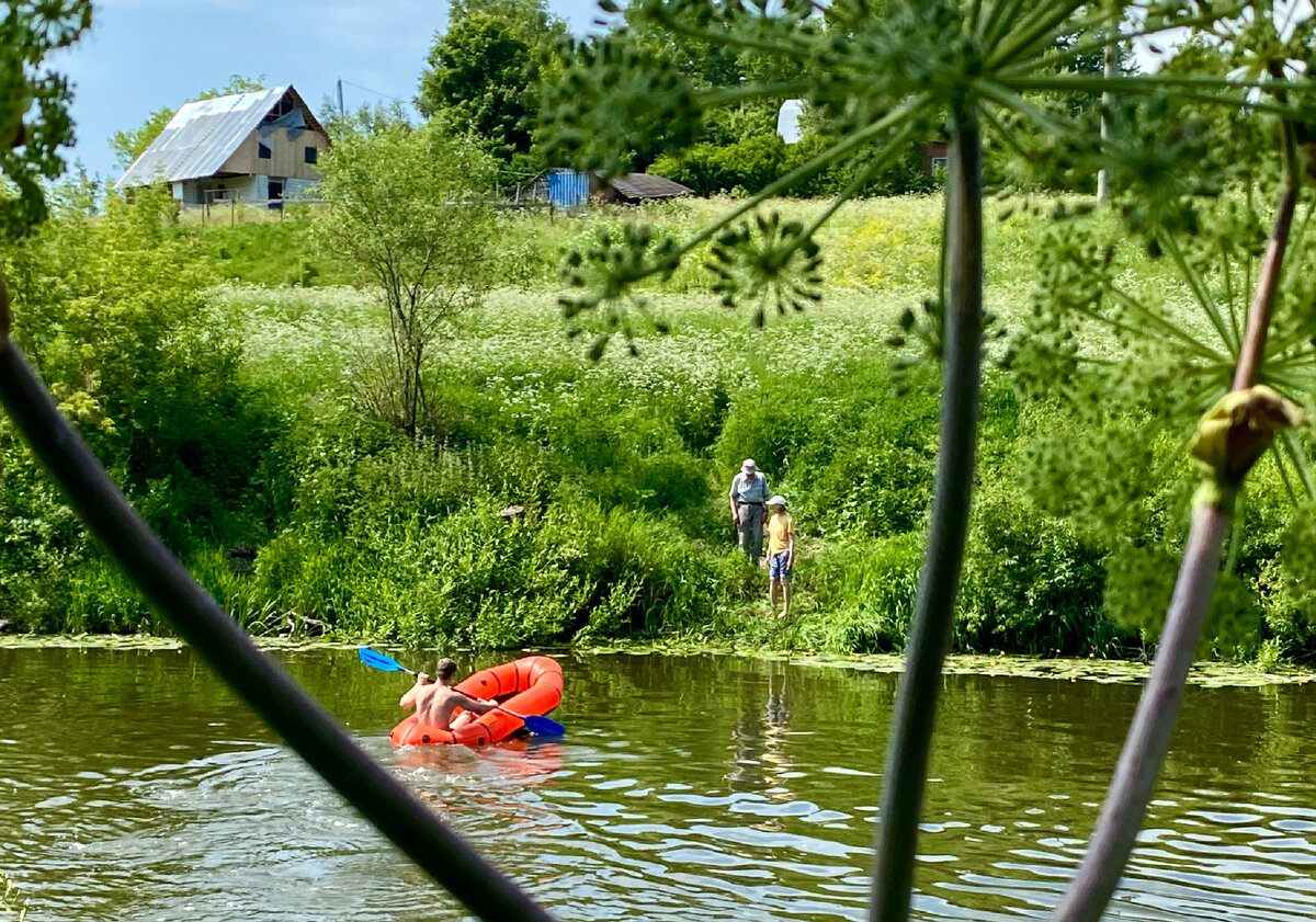 Прощаемся с наевшимся «охранником» и устремляемся в д.Селино к первому водоему на нашем пути. Через одурманивающе пахнущее цветущее поле подходим к реке.