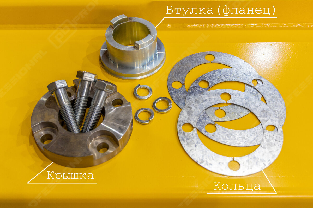 Осевая регулировка - это несложный и быстрый метод устранения люфта в проушинах. Она представляет собой комплект деталей и состоит из крышки, крепежа, регулировочных колец (толщиной 0.5 мм, 1.0 мм, 1.5 мм, 2.0 мм) и втулки (или фланца).