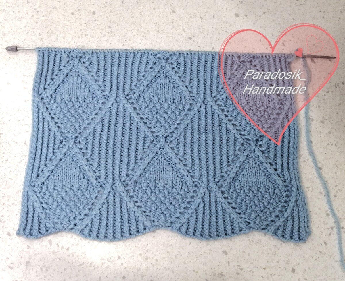 Этот узор напоминает половинки сердец, которые бесконечно стремятся друг к другу. Чтобы подчеркнуть границы узора, наклонные лицевые я провязывала вытянутыми.
