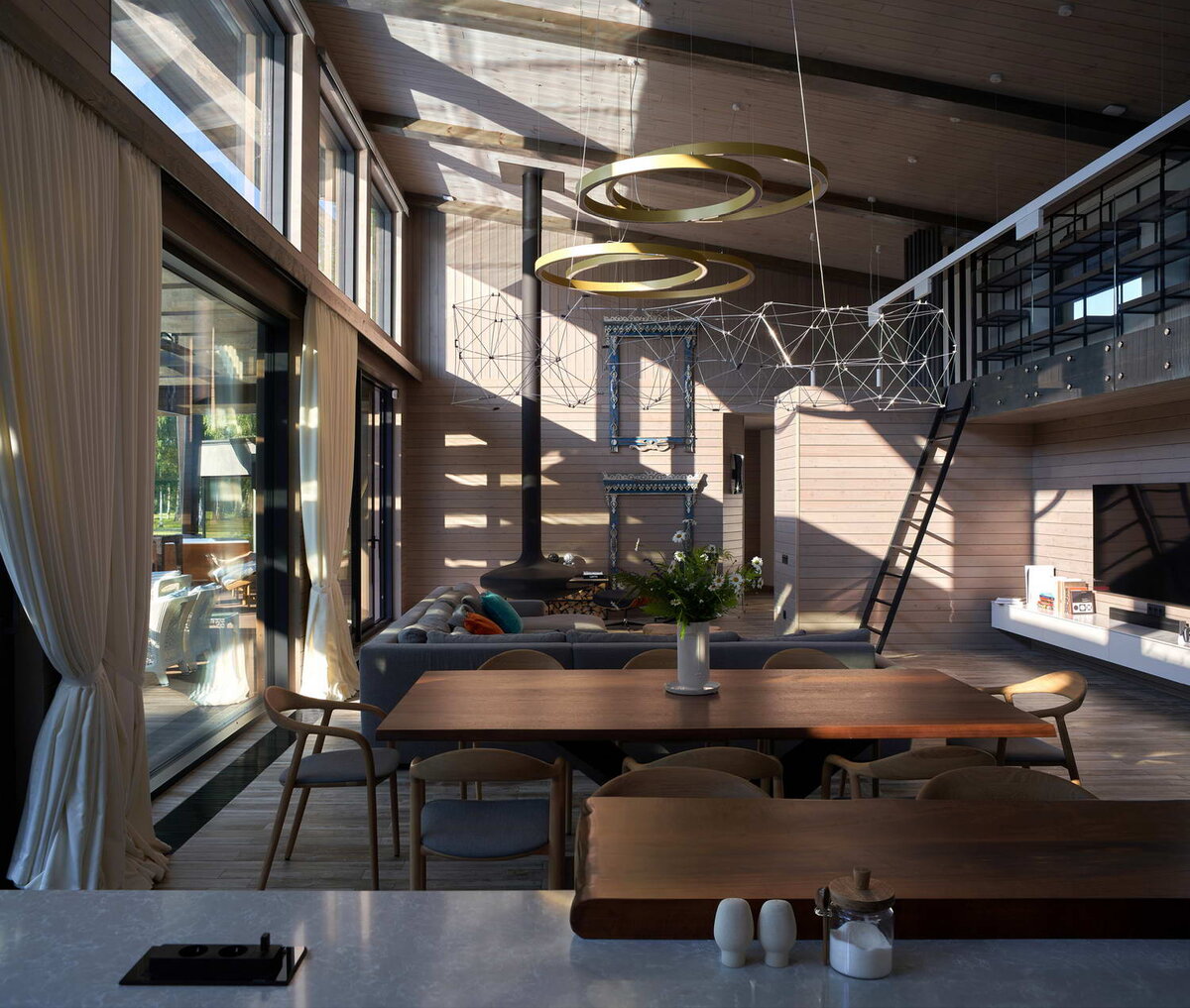 В плане дом делится на две части — парадную (гостиная, столовая и кухня) и приватную, где разместились спальня хозяев, две детские, санузлы и гостевая комната. Из гостиной, спальни родителей и сауны есть прямые выходы на террасу, на которой расположена летняя кухня с грилем, лаунж-зона с диванами, баром и гидромассажным бассейном. Заказчик, увлечённый игрок в гольф, желал совместить своё хобби с дачным отдыхом для семьи, поэтому для интерьера была выбрана лаконичная стилистика. Стены — натуральный брус, большие панорамные окна основных помещений обращены на поле для гольфа с его мягким рельефом и прекрасными видами. *** *** Дом впускает в себя окружающий ландшафт и сам становится его частью. В гостиной, в зоне камина, в качестве смыслового акцента на стенах повесили несколько старинных резных наличников, которые автор приметил в одной из окрестных деревень и выкупил у хозяев. Так в современный технологичный дом вошла частичка традиционного уральского быта, что создало особую атмосфер