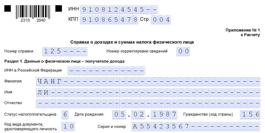 Сведения о том, что получателем дохода является иностранец, вводятся в раздел 2. Это проявляется в кодах по статусу налогоплательщика, гражданству и удостоверяющему документу. В разделах 3 и 4 информация по доходным начислениям и вычетам на детей вводится в обычном порядке.
