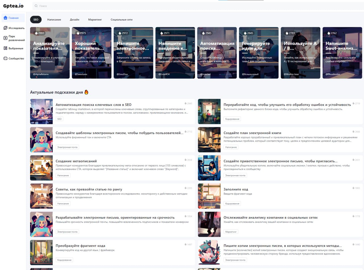 Сервис GPTea - мощный помощник, основанный на технологии OpenAI GPT-3.5. Сервис позволяет пользователям сэкономить время и упростить работу с помощью автоматического создания текста высокого качества. Функции включают в себя различные промты для ChatGPT, доступные для проверки без необходимости входа в учетную запись OpenAI. Это значит, что вы можете получить готовые варианты ответов на различные предложения и запросы прямо на сайте. Сервис также предлагает рерайтинг текста для разных категорий, таких как маркетинг, копирайтинг, кодирование и другие области деятельности. Вы можете легко оптимизировать свой контент, сделать его более понятным или привлекательным для вашей аудитории. Благодаря GPTea вы можете сократить время на создание качественного текста и улучшить свою производительность. Воспользуйтесь сервисом прямо сейчас, чтобы ощутить все преимущества использования GPT-3.5!