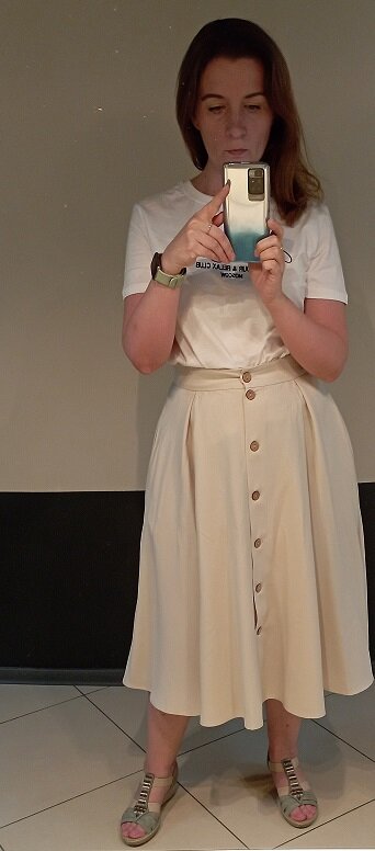 Добрый день! Начинаю разбор своих летних образов. Решила начать носить юбки и платья (очень много лет от них отказывалась в пользу джинсов). На это лето купила несколько юбок, сегодня покажу одну из них: Итак: Юбка - Wejali, куплена на Ozon по цене около 3000 р. Состав: лен + вискоза, размер 48. Сейчас там уже нет этого цвета (молочный), но осталось много других расцветок. Футболка - MODIS, распродажа старой коллекции, цена около 500 р., размер 46. Состав: хлопок 100% Босоножки - бренд не помню, покупала в "Платформе" за примерно 5000 р. Кожа + текстиль. Этот комплект мне нравится тем, что: