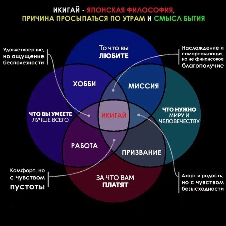Сегодня хочу немного про предназначение. В последнее время о нем очень много говорят, но от этого не становится легче его поиск. Что вообще такое предназначение? Если задуматься, то само слово говорит о том, что это нечто, для чего человек изначально предназначен. Согласитесь, звучит так, будто мы говорим не об уникальном создании, а скорее о вещи, которую создали на благо окружающих. Думать так о себе не особо приятно. Я же предлагаю думать о своем предназначении как о совокупности талантов и стремлений, которые позволяют нам не только приносить польз миру, в котором мы живем, но и реализовываться, изменять мир и делать его лучше для себя. К этому определению очень близка японская философия Икагаи, которая помогает находить удовлетворение, радость и осознанность во всех делах каждый день. На картинке в галерее мы видим, что вся наша деятельность делится на 4 сферы (это же вопросы, которые стоит себе задать для улучшения качества жизни): – Что я умею делать хорошо? – Что меня занимает