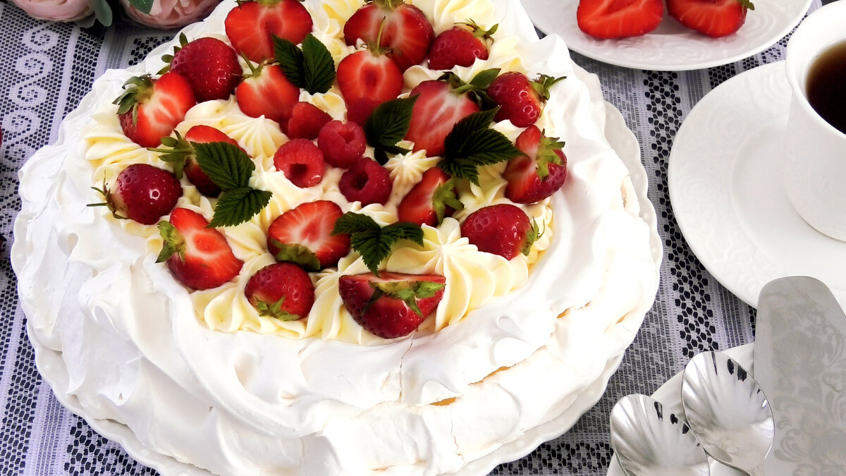 Всем привет! Сегодня давайте приготовим с вами очень летний десерт Торт Павлова. Этот торт, думаю, знают многие! Он очень и очень популярный и особенно в летний период, когда есть свежие ароматные яркие ягоды и фрукты. Для этого торта я готовила корж на швейцарской меренге и по хорошему его лучше выпекать с конвекцией, тогда он не даст трещины и более равномерно просушится, но и без нее получается отменный тортик. Для крема я использовала желтки, чтобы они не болтались потом в холодильнике с надеждой, что их куда- нибудь да пристроят😂 Крем получился отменный, очень нежный, легкий и в меру сладкий, как раз то, что нужно к меренговому коржу. Еще скажу пару слов про ягоды и фрукты. Для этого торта лучше всего подойдут ягоды с кислинкой, они отлично оттенят сладость коржа, привнесут свежесть и вкус. В принципе торт очень простой в приготовлении, ничего сложного в нем нет и справятся все! Самое главное готовьте с любовью и удовольствием! 📝Ингредиенты *Корж* -140 гр яичного белка( приме
