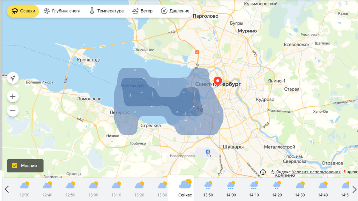 В отдельных районах Петербурга уже начался дождь. «Яндекс.Погода» показывает одну тучу над городом, пока небольшую, которая растянулась в основном над заливом.
