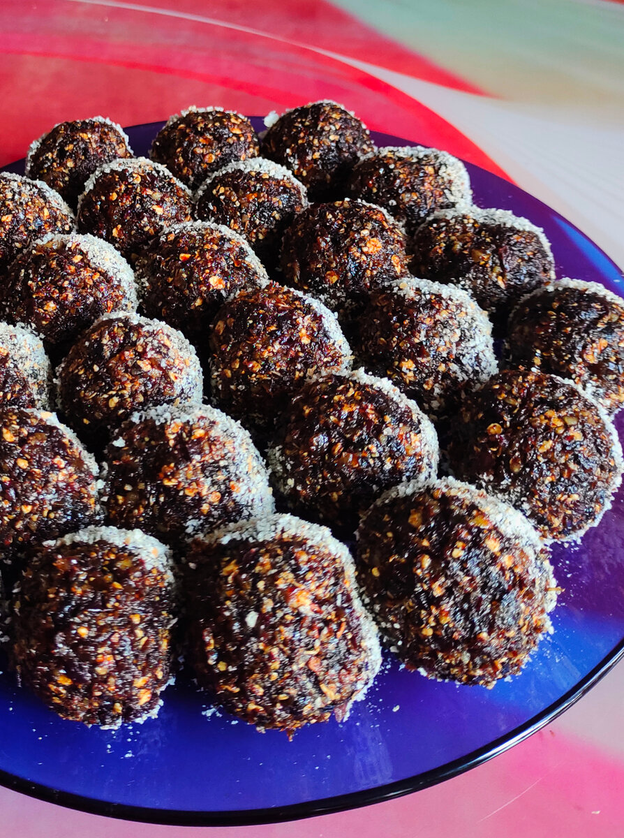 100 г кураги, 300 г изюма, 200 г чернослива, 200 г грецких орехов , сок одного лимона, две ложки меда, овсяные хлопья - 200 г ( измельчить в блендере ) Орехи поджарить, Сухофрукты и орехи пропустить через мясорубку . В эту смесь выдавить сок лимона, добавить мед. Всыпать овсяные хлопья. Хорошо перемешать . Сформировать шарики и наполовину обвалять в орехах, сухарях, какао или кокосовой стружке( на ваш выбор ). Очень вкусный десерт . Готовьте с удовольствием !