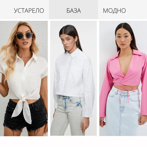 Какие модели добавить в гардероб, а какие отправить на переработку? Стильная рубашка может стать основой любого образа: кэжуал, делового или даже вечернего! Главное — не прогадать с моделью и не выбрать устаревший вариант. Смотрим, что сейчас пользуется популярностью, а от чего давно пора избавиться. 1. Базовая белая рубашка Устарело: строгая, приталенная белая рубашка все еще антитренд. И даже несмотря на то, что вектор моды берет курс на женственность, элегантность и акценты на талии, вспоминать об этой детали гардероба пока не стоит. База: белая рубашка прямого кроя. Беспроигрышный вариант, в котором и в пир, и в мир, и на пляж. Обратите внимание на модели Lime, цена: 1 999 руб. Модно: белая рубашка оверсайз с приставкой «гипер». Трендовая модель должна быть не просто объемной, а такой, будто вы позаимствовали ее из гардероба своего парня или купили вещь на пару-тройку размеров больше. Вот отличный вариант: рубашка The Select Moscow, цена: 8 900 руб. 2. Рубашка из денима Устарело: р