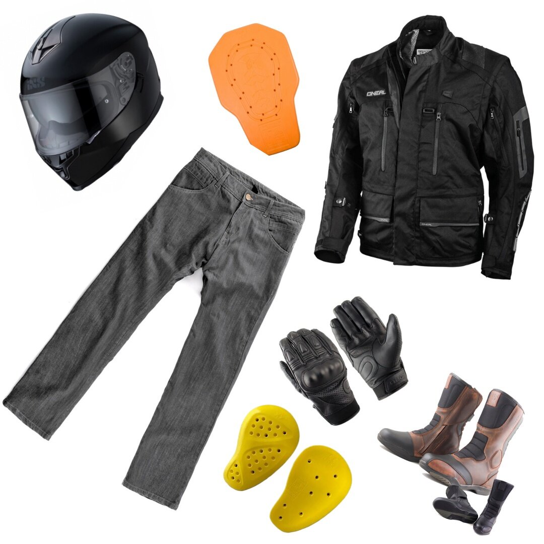 Комплект мотоэкипа состоит из 7 позиций (мотоботы, мотокуртка, мотоджинсы, шлем, перчи, защита для спины и бедер).