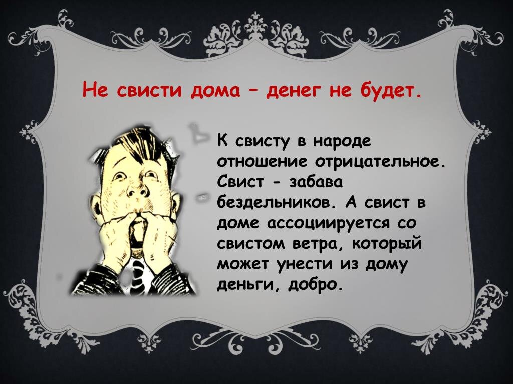 Все знают – свистеть дома нельзя. Наиболее актуальная на эту тему примета, что если в доме свистеть, то денег не будет. Но мало кому известно почему. С давних пор свист неразрывно связан со звуком сильного ветра. А он, как правило, обладает свойством разрушения и сметает все на своем пути. В старину, после таких ураганов, людям приходилось восстанавливать все заново, тратить свои деньги. Поэтому имитировать даже слабые звуки ветра в доме считалось плохой приметой. Но более всего ее придерживались моряки во время плаванья, боясь даже слабым посвистом накликать шторм. Также люди считали, что любят посвистеть бездельники, так как у работающего человека времени на это нет. По старинным поверьям, при помощи свиста между собой общается нечистая сила. Поэтому свистя в доме, можно как бы пригласить в него темные сущности. Не любит этого звука и домовой. Если в доме часто свистеть, то он может совсем покинуть его, забрав с собой достаток и благополучие хозяев. Если, домовой покидал порог дома,
