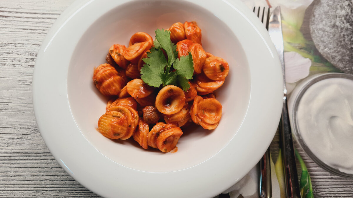 Сытное и вкусное блюдо без особых хлопот и горы грязной посуды. Для приготовления нам понадобится одна сковорода и совсем немного времени. Список ингредиентов и их количество вы можете найти в конце статьи. Процесс приготовления: 1. Сердечки моем, очищаем от пленок (если они есть), лишнее отрезаем, режем на 2-3 части, чеснок мелко рубим, обжариваем на растительном масле минут 5-7. Мне в этот раз попались по акции утиные сердечки, готовила с ними. Принципиальных вкусовых отличий от куриных не заметила. 2. Добавляем к сердечкам протертые томаты (можно взять томаты в собственном соку и пробить их блендером), 100 мл кипятка и тушим под крышкой на медленном огне до мягкости сердечек. У меня на это ушло около 30 минут. 3. Добавляем в соус соль-перец по вкусу, орегано и немного зелени. Для меня идеальная зелень в этом блюде - петрушка, вы можете добавить любую по своему вкусу. Всыпаем макароны (любые, какие вам больше нравятся), доливаем кипятка столько, чтобы вода слегка покрывала макароны,