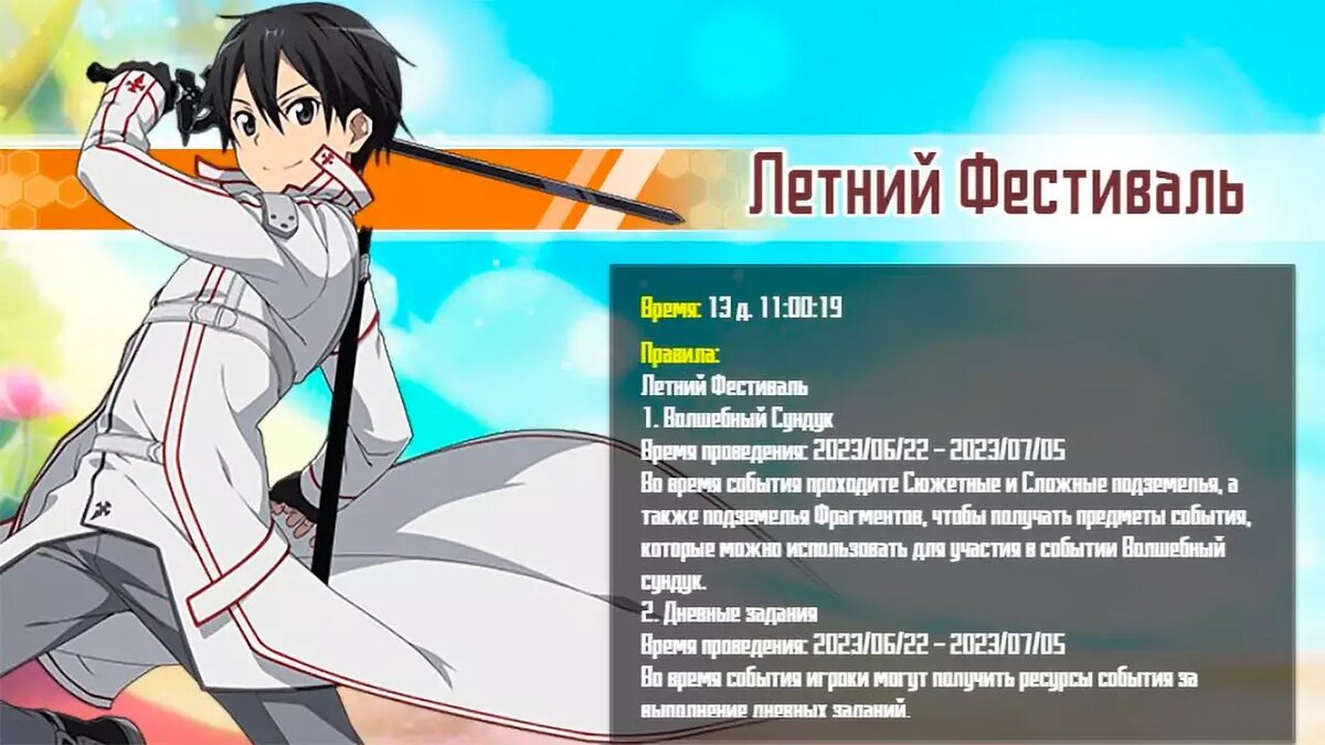 В игре Мастера Меча Онлайн 2 установили обновление от 22 июня 2023 года, запустив ивент "Летний фестиваль" и очередной сезон "Арены чести" для любителей PvP. Событие "Летний фестиваль" позволяет накапливать валюту "Зонтики" за посещение игры, зачистку подземелий и выполнение заданий. Накопленные зонтики стоит обменять на "Волшебный сундук". Вновь начались кроссерверные сражения на "Арене чести", включена "Монополия", "Джекпот" и "Рулетка". Дополнительно в SAO2 обновили награды за вход и добавили Беркули во Временном призыве. Новость на сайте: https://topinator.ru/1048-pvp-arena-chesti-i-sobytie-letnij-festival-v-mastera-mecha-onlajn-2.html