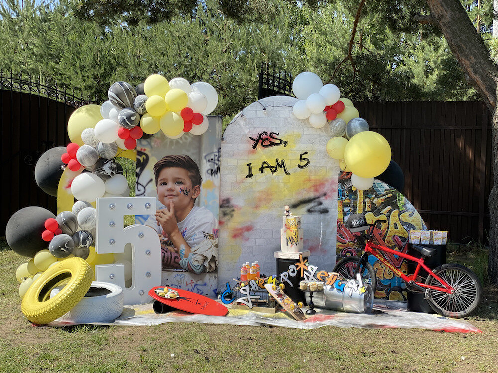 Этот праздник оформила наш декоратор Женя — вы уже видели в нашем блоге его день рождения с Молнией Маккуином. Но Максим уже подрос, у него появились более взрослые увлечения 🙂 От мультика с тачками он перешёл к увлечению спортом: на праздник ему подарили трюковой велосипед, скейт и баланс-борд. Женя решила сделать подарки частью оформления — получилось очень в тему! Оформление вышло очень крутым, именинник был в восторге! Фон украсили граффити, а разноцветные балончики стали частью фотозоны. Капкейки украсили съедобными граффити Бэнкси! Женя дополнила оформления стильной и минималистичной цифрой с лампочками, а ещё крашеными покрышками. Десерты были простыми, но стильными — их украсили мазки краски. Торт стилизовали под стену — посмотрите, как круто кондитеры передали её шероховатую текстуру! А уже поверх “стены” были нанесены граффити. Вы же знаете, дети любят есть всё необычное 🙂 Наш декоратор кастомизировала не только бутылочки, но и коробочки для попкорна. Как видите, тематики