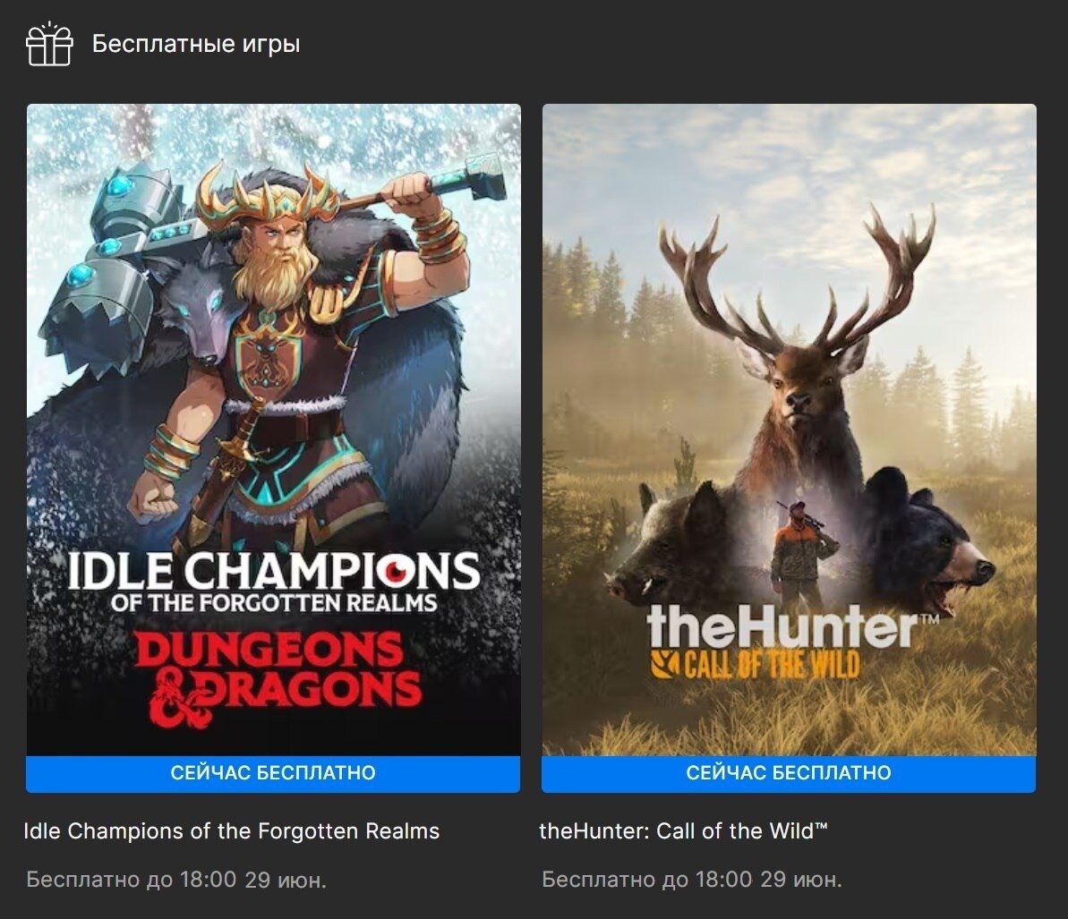 В цифровом магазине Epic Games Store стартовала раздача популярного симулятора охотника с множеством положительных отзывов и бандла для Idle Champions of the Forgotten Realms, который стоит более 8 тыс. рублей. Геймеры могут бесплатно забрать theHunter: Call of the Wild и набор Вульфгара «Славные легенды» при заходе в Idle Champions of the Forgotten Realms, действие которой происходит в мире Dungeons & Dragons. Акция продлится до 29 июня 18:00 по мск. Отметим, что theHunter: Call of the Wild недоступна для пользователей из России, поэтому для ее получения придется завести аккаунт из другого региона и воспользоваться VPN. До 26 июня в Steam проходит фестиваль демо, в рамках которого можно бесплатно опробовать более 100 игр. Заглавное фото: theHunter: Call of the Wild