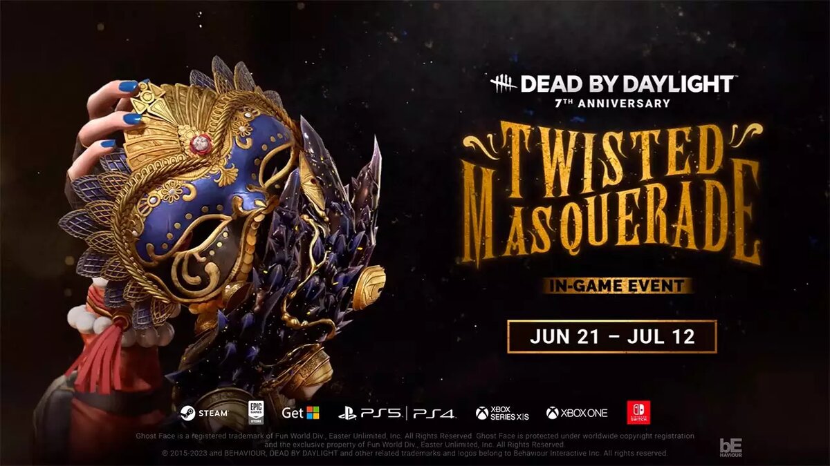 С 22 июня по 13 июля 2023 года в онлайн игру Dead by Daylight вернулся ивент Twisted Masquerade с уникальными масками, украшениями на локациях, книгой события и ежедневными наградами за вход. Полностью переделана часовня Отца Кэмпбелла и размещены тематические украшения на тему маскарада. Появились маскарадные фонарики, ящики с инструментами, "террормису" и аптечки. Во время геймплея можно найти приглашения на специальных постаментах, получив одну из 12 эксклюзивных масок со способностью. Сохранив хотя бы 1 заряд маски можно вынести её после открытия ворот или люка. Для убийц есть маски Медсестра, Легион, Демон-они, Мор, Рыцарь и Сингулярность, а выжившим доступны Мэг Томас, Габриэль Сома, Хонас Васкес, Зарина Кассир, Джефф Йохансен и Феликс Рихтер. Дополнительно открыта книга с персонажами Нея Карлссон и Деревенщина, подарочными амулетами и костюмами. Посещайте DbD в дни ивента, получайте очки крови и радужные кристаллы. Новость на сайте: https://topinator.ru/1052-v-dead-by-daylight-