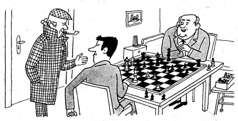 В гостинице “Грюне Танне” все было готово к большому приему. Официант в последний раз спустился в подвал, чтобы еще раз проверить, достаточно ли подготовлено вина. И вдруг... О ужас! Половина запаса вина исчезла. Инспектор Варнике, который совершенно случайно оказался в этом городе, тотчас же прибыл в гостиницу и, не мешкая, приступил к расследованию дела. Он быстро опросил метрдотеля, официантов, горничных, повара и всех тех постояльцев гостиницы, которые оказались поблизости. Никакой ясности. Продолжая розыски, Варнике заглянул в одну из комнат гостиницы. Двое находившихся там мужчин играли в шахматы и были явно раздосадованы! бесцеремонным вторжением инспектора. Они — мастера спорта по шахматам, заявили они Варнике, приехали сюда на шахматный турнир, который начнется через несколько часов. Перед турниром они решили основательно потренироваться и с самого утра не выходили из комнаты. Варнике собирался уже было извиниться и уйти, как вдруг обратил внимание на одно обстоятельство, кото