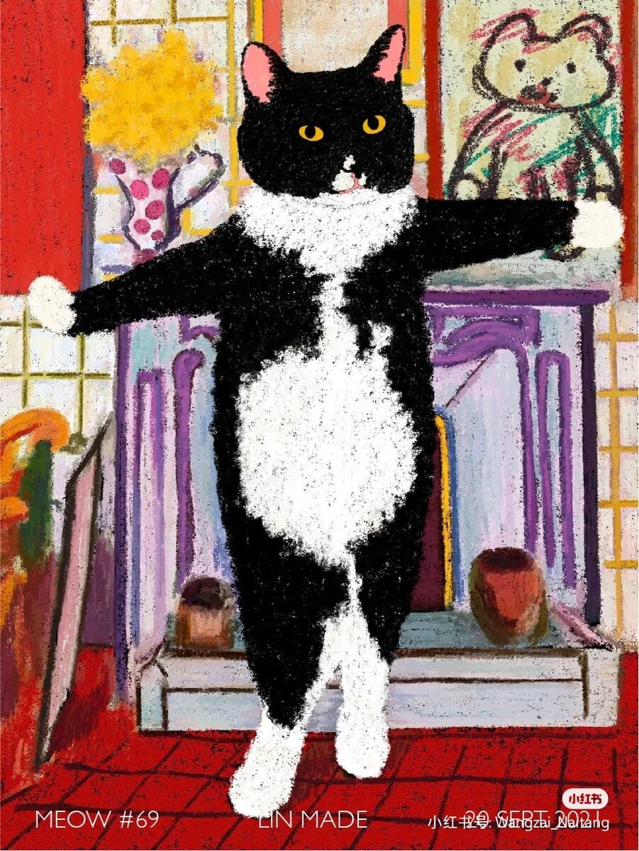 Хозяин кота Коровки был иллюстратором и очень любил творчество художников начала XX века: Поля Гогена, Анри Матисса, Натальи Гончаровой, Эрнста Людвига Кирхнера и других. И все-то на их шедеврах ему нравилось, но чего-то не хватало 🤔Чего же? Конечно, чёрно-белого котика Коровки!