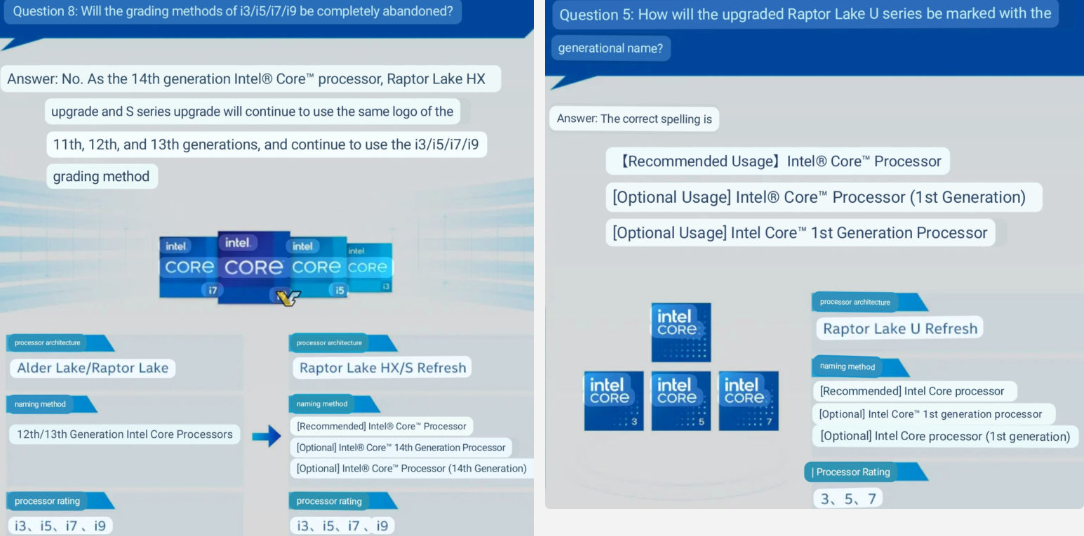 Компания подтвердила полную информацию об обновлении системы наименования своих процессоров, начиная со следующей серии. В официальной презентации упоминались только чипы Meteor Lake и мобильные чипы следующего поколения, использующие новые бренды Core 3/5/7/9. Следующая серия процессоров Intel для ноутбуков и настольных компьютеров также будет включать обновление серии Raptor Lake. Однако вместо того, чтобы упростить номенклатуру, предстоящая серия будет разделена на старые и новые схемы именования. Даже серия Raptor Lake будет разделена на семейства Core и Core i. Intel China пошла дальше и предоставила краткий пояснительный материал для своих поклонников. Эти материалы не были преданы огласке среди международного сообщества, что вызывает сожаление, но на то была веская причина. Intel просто не подтверждала существование серии Raptor Lake Refresh до сегодняшнего дня, так что эти материалы — первое официальное упоминание о подобных планах компании. Диаграммы сообщают, что название Cor