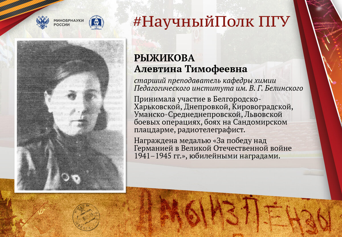 Военные воспоминания Алевтины Трофимовны Рыжиковой (1921–2001) — выпускницы Пензенского государственного педагогического института им. В. Г. Белинского (1950), старшего преподавателя кафедры химии ПГПИ в 1964–1978 гг. В годы Великой Отечественной войны служила радиотелеграфистом, гвардии сержант. Она была награждена медалью «За победу над Германией в Великой Отечественной войне 1941–1945 гг.», значком «Отличный связист» и юбилейными медалями.